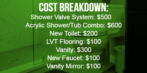 This doesn’t include paint, trim, a new fan, or any of the other small things that tend to pop up. It also assumes you’re getting the cheapest products you can find. Of course, this also means you’re installing everything. If you go the DIY/Budget route: keep your process simple. That means stay away from tile: get a basic acrylic wall system, a pre-built vanity from a major retailer, and maybe some vinyl plank flooring or laminate vinyl sheet.